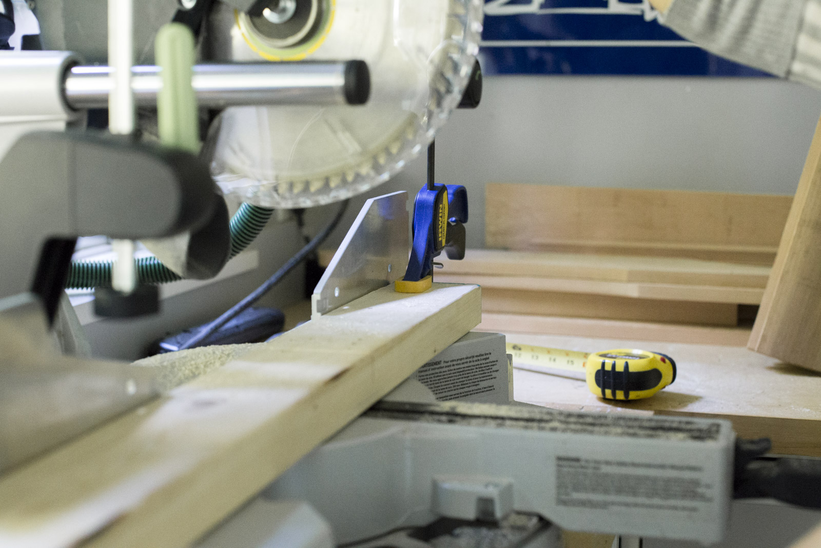 Slide the two-by-four up against this block and make the cut. Measure and make sure the length is exact before continuing on with the rest of the wood. This technique will save you so much time. There are 54 pieces in a Jenga set, so you will need to cut the two-by-fours into 54 10.5" pieces.